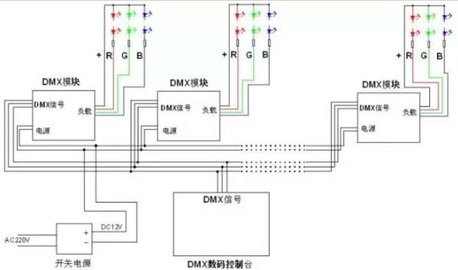 DMX512控制系統(tǒng)示意:若干臺(tái)RGB燈具,每一臺(tái)燈具內(nèi)部都包含1個(gè)DMX模塊,該模塊在同時(shí)接收到了電源供電和控制器信號(hào)的情況下,才會(huì)驅(qū)動(dòng)LED燈珠亮暗變化,從而來調(diào)節(jié)顏色的變化。
