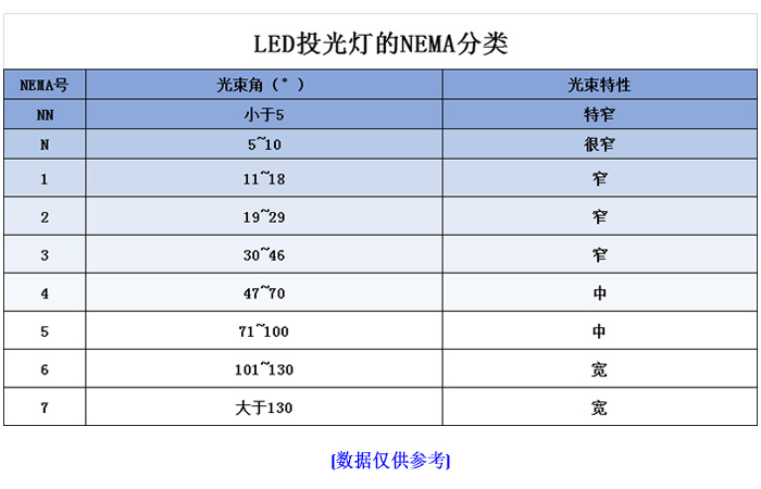 LED投光燈在水平方向和垂直方向上的光束角有可能不同。美國電氣制造聯(lián)合會(huì)(NEMA,National Electrical Manufactures Associa-tion) 根據(jù)光束角的大小將投光燈分成9種,如下圖: