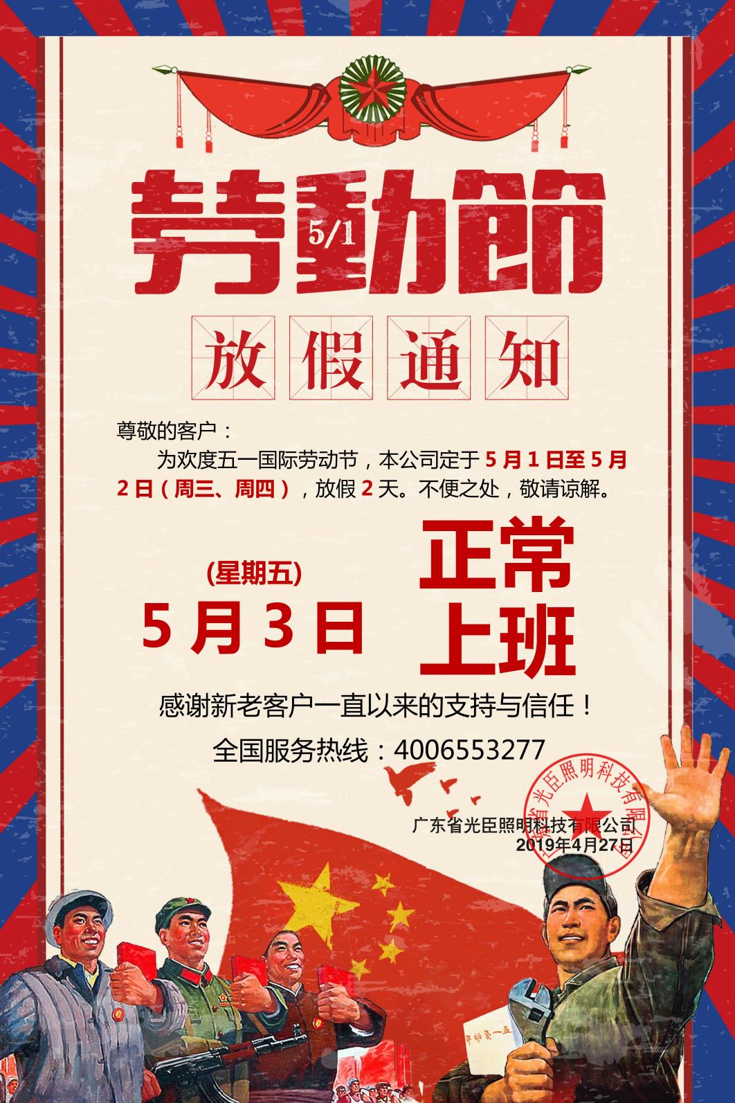您現(xiàn)在的位置:首頁 > 光臣動態(tài) > 光臣照明,2019年五一勞動節(jié)放假通知