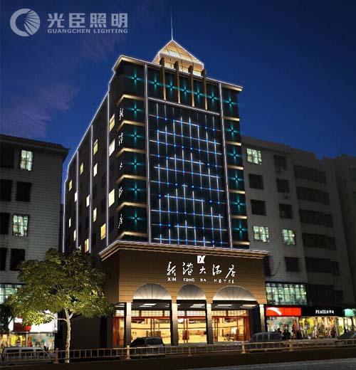由于薛總并不是專業(yè)做外墻亮化施工,接觸這類項目并不多,所以新港大酒店外墻亮化全權交由光臣照明負責,從方案設計到燈具選型、整個項目的預算規(guī)劃,光臣照明都能熟練的處理。