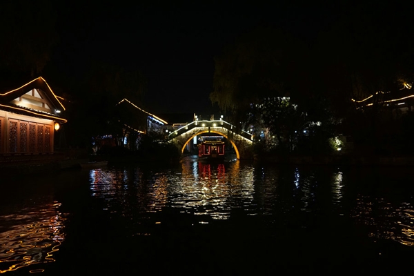 LED亮化讓水街的夜景更為誘人,臨水而立的亭臺樓閣,具有鹽城水鄉(xiāng)風(fēng)情和海鹽歷史文化風(fēng)貌的景區(qū)特色,在燈光的映襯下更具內(nèi)涵,樓閣、石橋、水、燈光融合成秦淮勝境的美景。