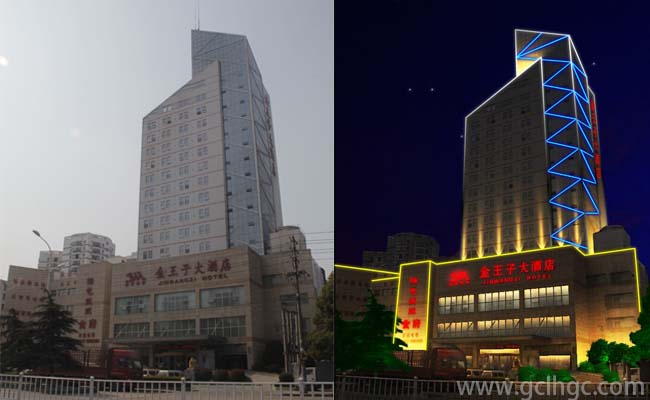 金王子大酒店作為當?shù)氐囊蛔貥诵越ㄖ?,酒店方對亮化這一塊非常重視,亮化方案不能太過于浮夸、手法不能太重、耗電不能過大等等,施工方肖總也是方案改了一次又一次,關(guān)于耗電這個問題也就意味著布燈的數(shù)量不能多,盡量少。但是燈具少了布燈的方案要配合好,不然會影響整體效果。