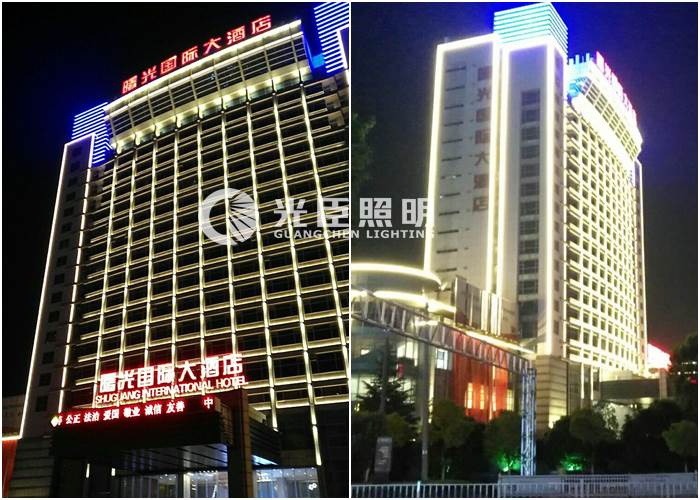 該酒店原本是已經(jīng)有做LED夜景亮化的,但是由于原來(lái)的亮化過(guò)于簡(jiǎn)單,燈光效果暗,所以為了讓酒店成為當(dāng)?shù)匾咕暗囊淮罅咙c(diǎn),提升酒店整體形象,近期對(duì)它進(jìn)行亮化燈光的提亮工作。光臣照明有幸為這次項(xiàng)目提供了亮化燈具。