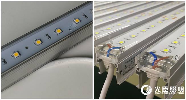 左為客戶樣品:灌膠太少,燈珠裸露 右為光臣產(chǎn)品:灌膠飽滿,完全覆蓋表面元器件,甚至與鋁材持平