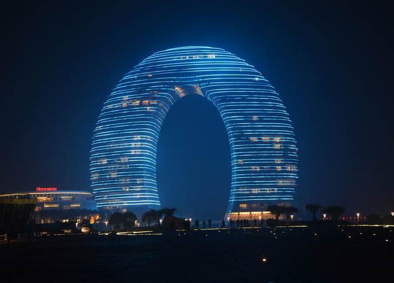 當(dāng)然,也有的酒店是造型特殊,地標(biāo)性極強(qiáng)的,適合豐富多彩的亮化設(shè)計,如用全彩的洗墻燈或者線條燈做動態(tài)效果。