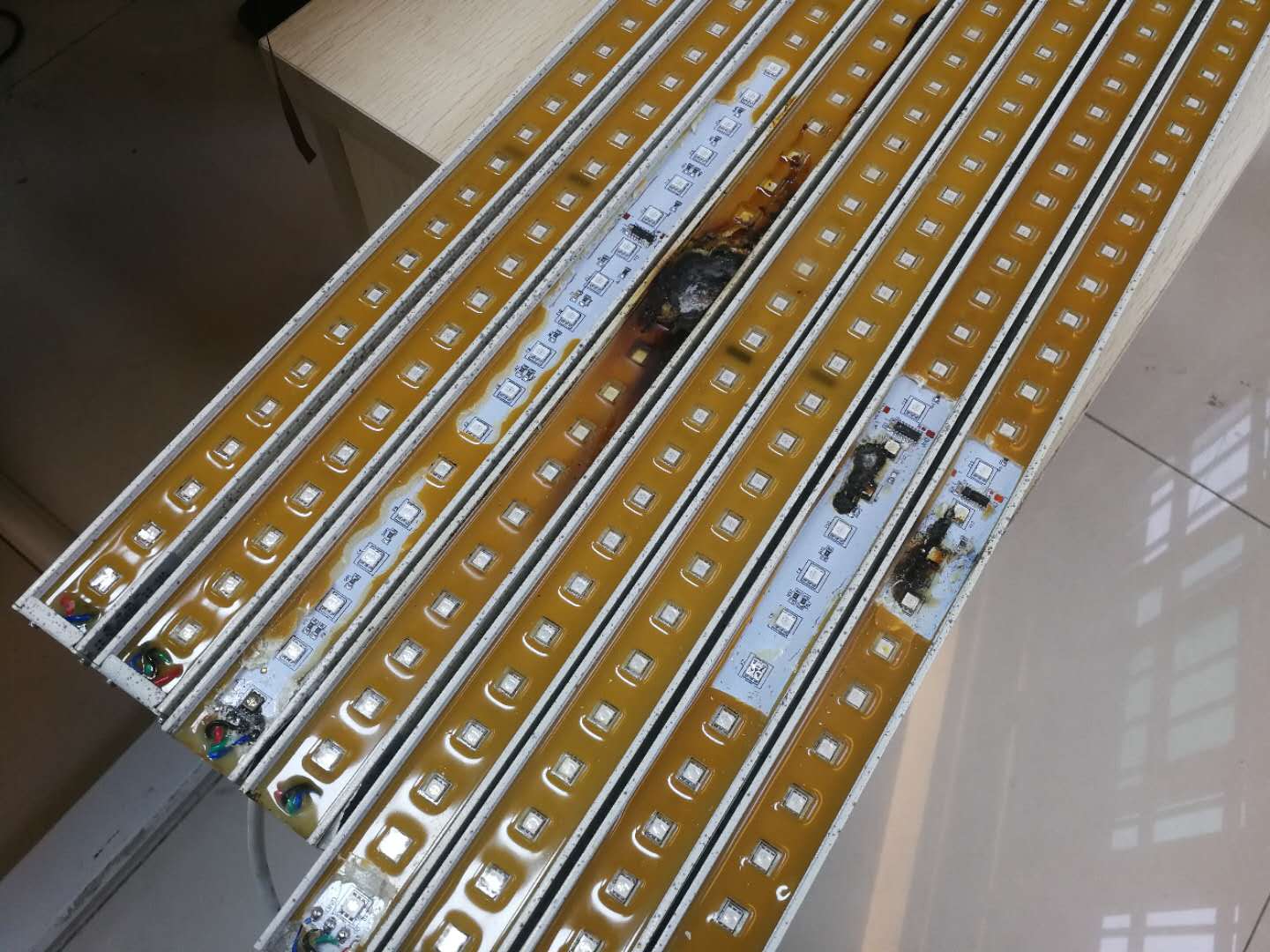 近期就有一個(gè)客戶寄回來一批燈具要維修,反饋說安裝完畢亮燈之后啪地一聲就燒糊了,經(jīng)檢查發(fā)現(xiàn)原來是有一個(gè)工人新入隊(duì)的不了解,沒看線路安裝圖,以為直接接電就可以,結(jié)果接了220V電直接導(dǎo)致燈具燒毀。