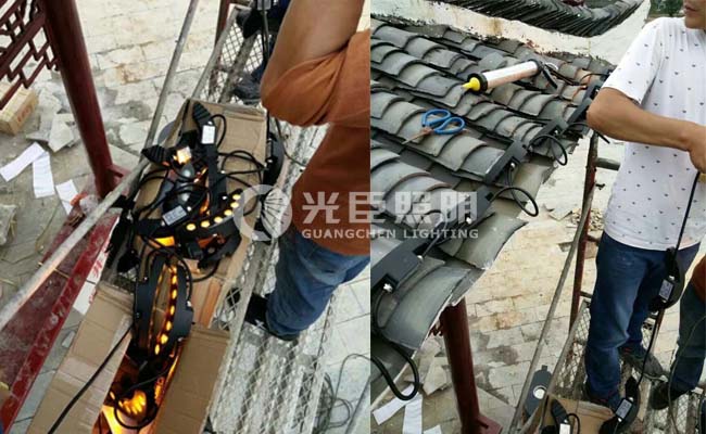 大部份瓦楞燈的安裝都選擇第二種安裝方法。以上是我們貴州的一個(gè)旅游景區(qū)在安裝LED瓦楞燈的圖片。工作們把瓦楞燈先串接好后再把鋁片調(diào)整好角度進(jìn)行粘合。