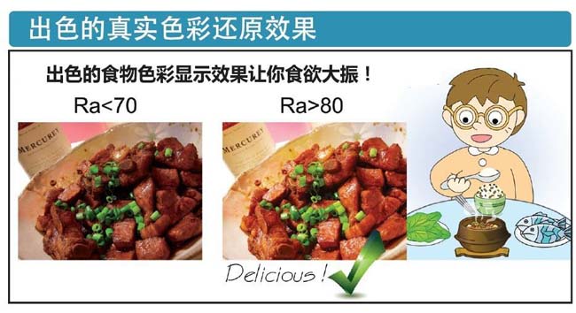 如果說日光的顯色指數(shù)是100,按現(xiàn)下國際照明委員會提出的標(biāo)準(zhǔn):照明燈具能達(dá)到80以上則算是顯色性較好的燈具,而視光源的種類不同,白熾燈和節(jié)能燈的顯色指數(shù)普遍高于LED燈具的顯色指數(shù),LED光源達(dá)到70~90內(nèi)也算不錯的效果。當(dāng)然,用于室內(nèi)照明的燈具需要盡可能的達(dá)到80以上。