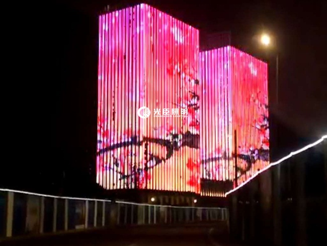 A、B雙子大樓夜景亮化主要以全彩線條燈做屏的形式,采用DMX512八段RGBW線條燈,合計(jì)一萬多米,縱向安裝。