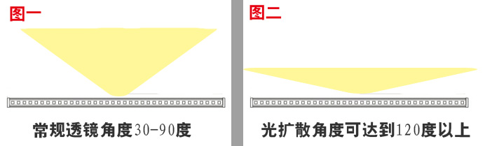 我們用兩張圖讓大家看個(gè)明白,LED線條燈為什么要選用光擴(kuò)散透鏡。如上圖,圖一比喻成我們常規(guī)的LED線條燈透鏡的發(fā)光模式,圖二比喻成我們加蓋了光擴(kuò)散透鏡的發(fā)光模式,從兩張圖片的對(duì)比當(dāng)中我們能清楚的知道,光擴(kuò)散的作用是把光束往左右兩邊伸展以達(dá)到無(wú)暗區(qū)的亮化效果。