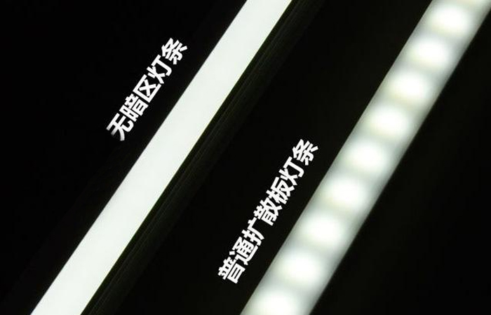 首先,大家來看一下上面這張圖,圖片中我們能了解到LED線條燈有暗區(qū)和無暗區(qū)的區(qū)別,出現(xiàn)暗區(qū)的線條燈光束呈現(xiàn)出點狀形態(tài),無暗區(qū)線條燈的光線十分柔和,原因在于:選用了光擴散材料的PC面罩。