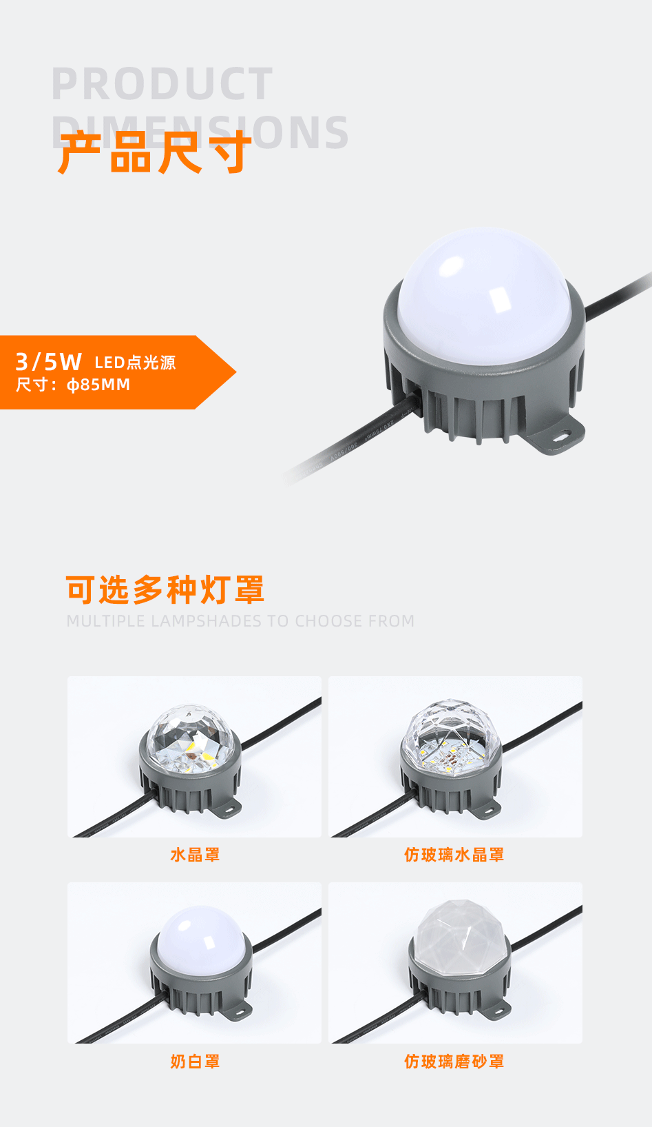 產品尺寸:Φ85mm 燈具光源: 5050貼片 控制方式: 單色常亮、DMX512控制 適用場所: